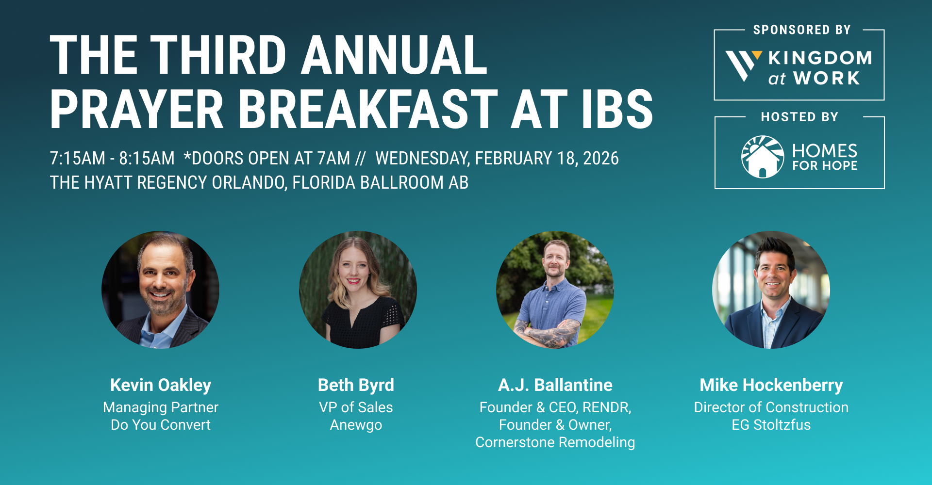 Join us at the Third Annual Prayer Breakfast at IBS sponsored by Kingdom At Work and hosted by Homes for HOPE.
